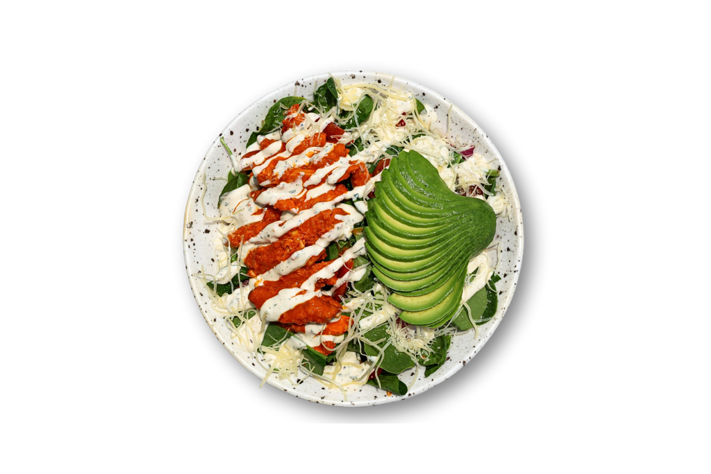 Mix de hojas orgánicas, tomates cherry, queso parmesano, aguacate y buffalo air fried chicken (150gr), aderezado con ranch greek light.